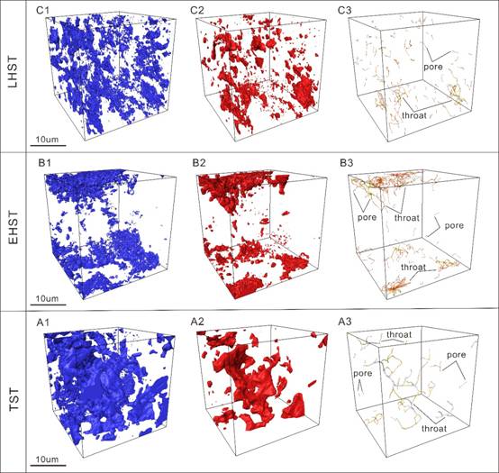 针对上述科学问题,研究团队采集了涪陵页岩气田焦石坝产区3口典型井的样品,运用岩相学、地球化学、微观岩石学和纳米级计算机断层扫描技术等手段,主要取得以下认识:(1)涪陵地区富有机质页岩储层具有从米级-微米级-纳米级多尺度的非均质性特征(2)奥陶纪-志留纪转折期古气候变化控制了富有机制页岩沉积过程,导致了页岩的矿物及有机质在种类和含量上的沉积差异(3)不同沉积背景下的富有机质页岩经历了差异性的成岩过程,进一步改造了其矿物和有机质组成(4)差异性的沉积环境及其后不同的成岩改造过程是导致页岩储层的纳米孔隙体系纵向差异的根本原因。研究成果对于页岩非均质性的特征、成因和对储层的影响做了全面的总结与阐述,是探究页岩气差异富集机理的基础。