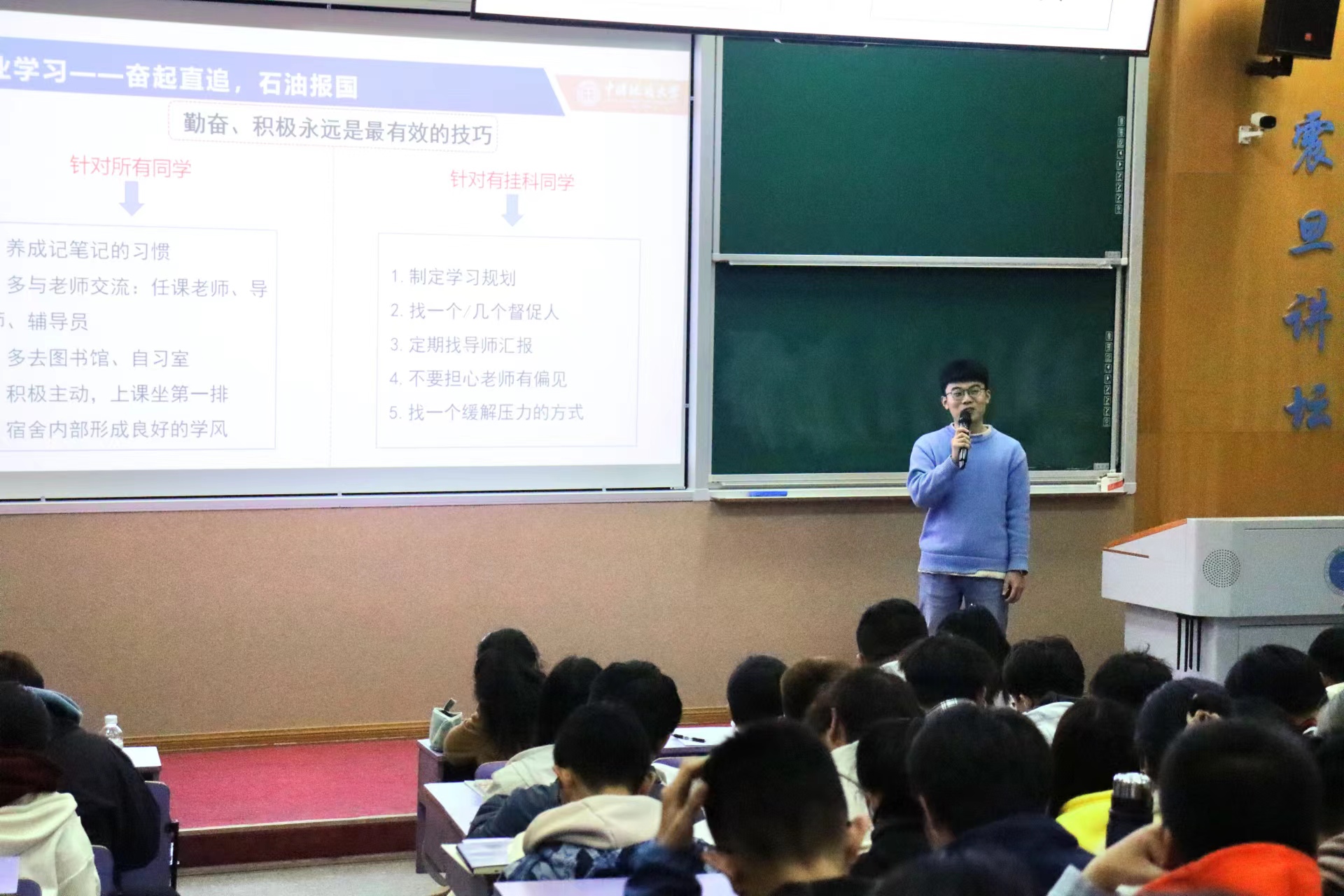 03月26日下午,best365网页版登录第十三期红星·朋辈榜样论坛在教三楼110举行。辅导员刘明辉,石油工程系2022级研究生聂思嘉,2022级全体本科生参加。刘明辉主持。