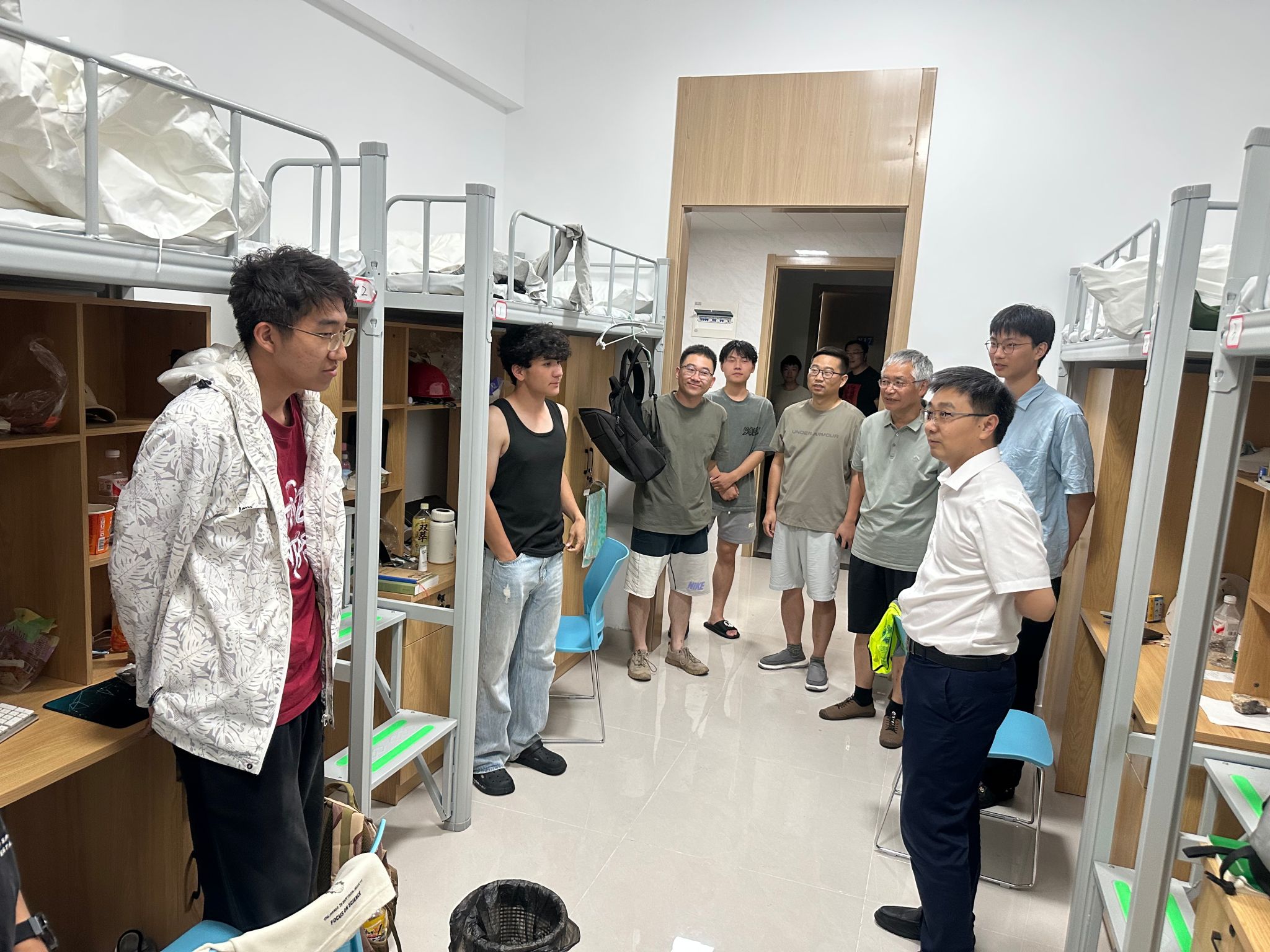 汪再奇一行在教职工宿舍、学生宿舍看望慰问实习师生,了解野外教学安排与进展,细致了解了师生在基地的生活学习情况。他充分肯定了实习师生在野外实践教学中的表现,赞扬了野外教学团队在野外教学中充分融入思政元素的做法。他叮嘱教学团队一定要高度重视野外教学实践的安全,把安全放在重中之重,平稳顺利完成威海教学实习。他勉励同学们,要强化野外实践工作基本功,按照教学计划扎实完成野外实践中的各项任务,磨砺意志品质,为未来从事工作打下素质基础。
