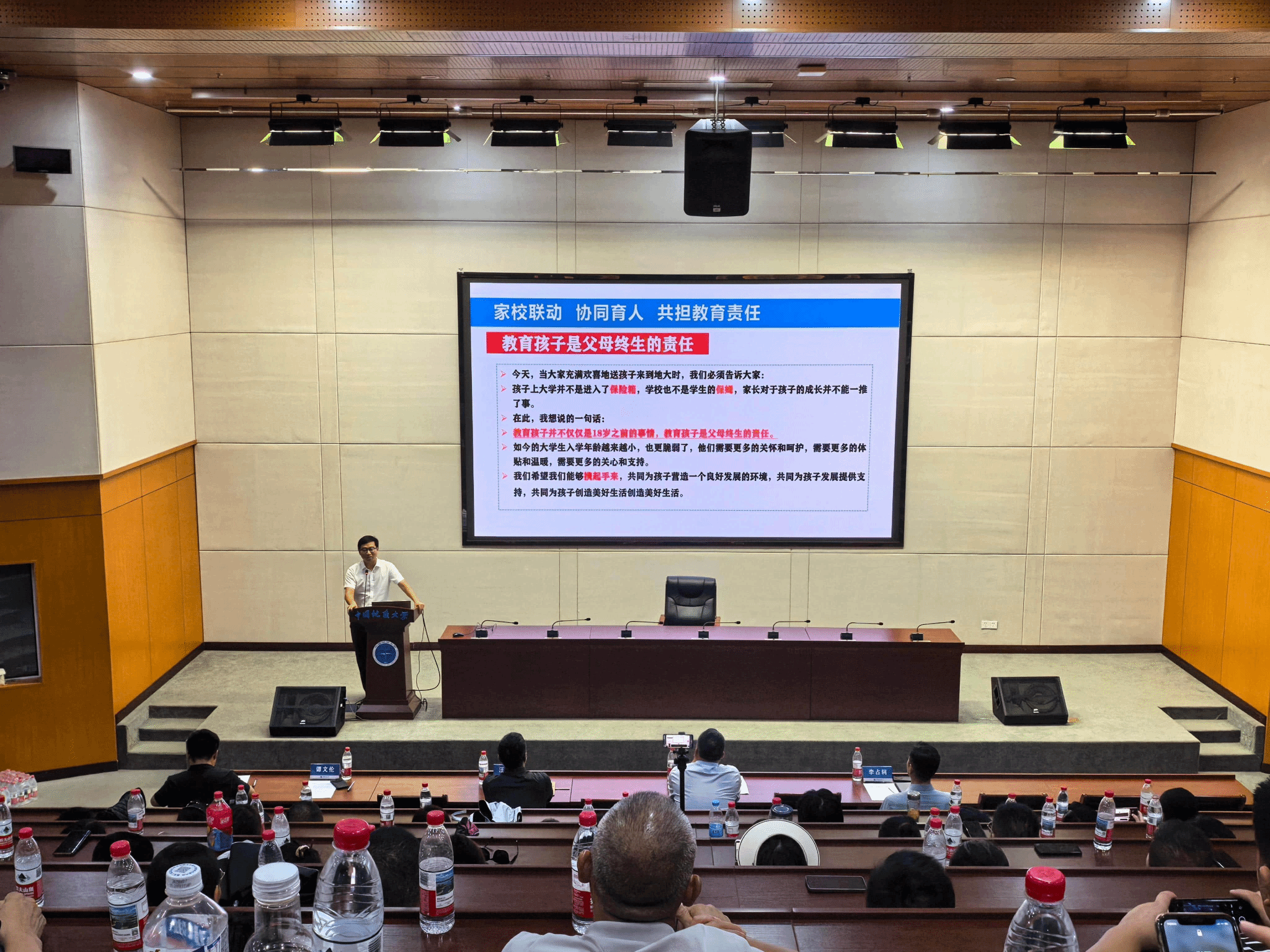朱红涛介绍学院基本情况。他首先代表学院对家长的到来表示热烈欢迎,并从办学历史、学科特色、师资队伍、学生培养、就业发展等方面详细介绍了学院办学与人才培养的具体情况。