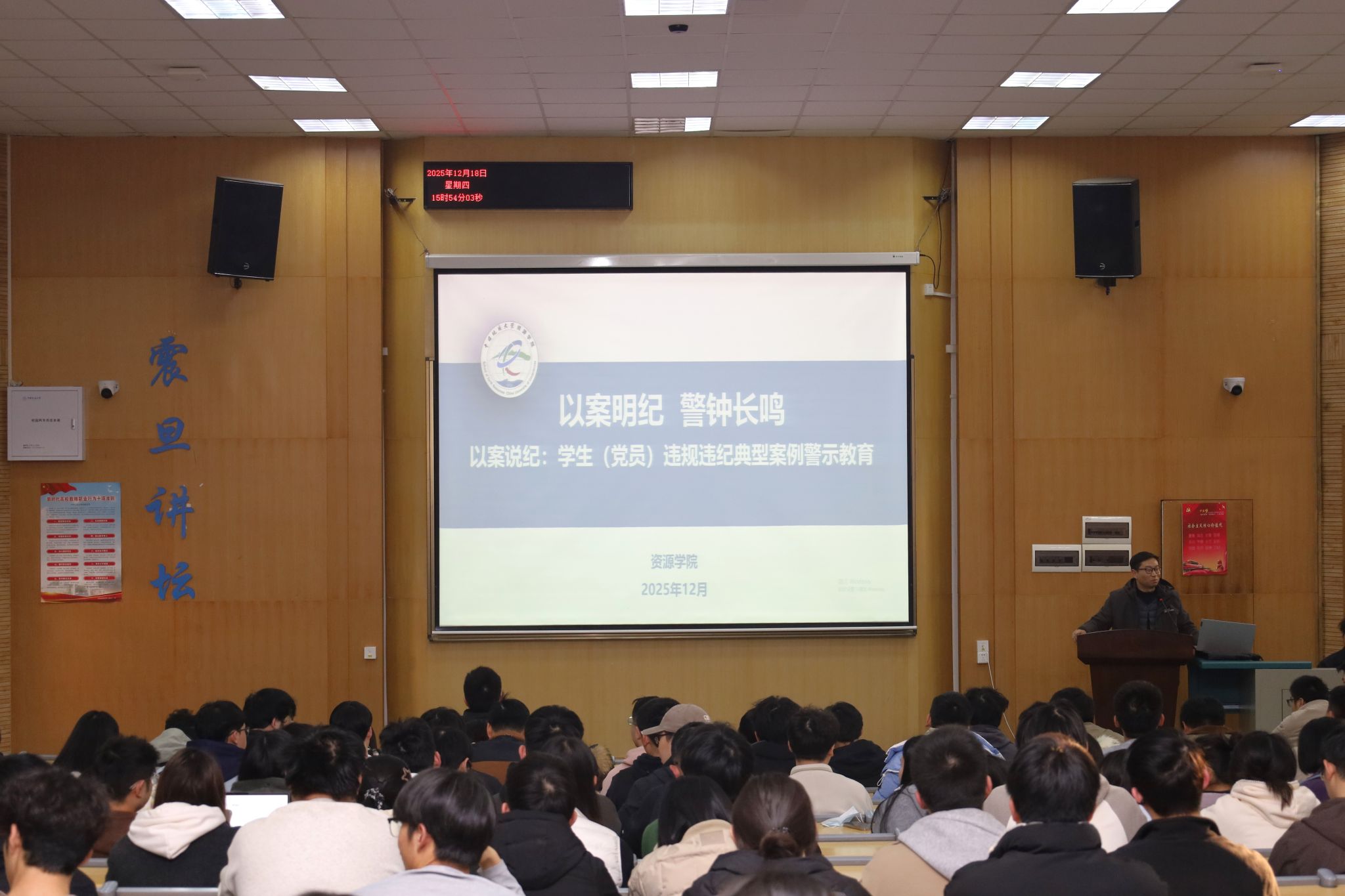 会上,谭文伦以“以案明纪、警钟长鸣”为主题开展警示教育,通过典型案例剖析违纪行为的严重危害,重申校纪校规的刚性约束。他强调,全体学生须将纪律要求内化于心、外化于行,自觉做到遵规守纪。针对案例中发表不当言论、学术不端等问题,他强调党员必须垂先示范,在坚定政治立场、恪守学术诚信、规范日常言行等各方面走在前列,主动维护纪律的严肃性,以自身的清正言行带动广大同学共同营造风清气正的校园环境。