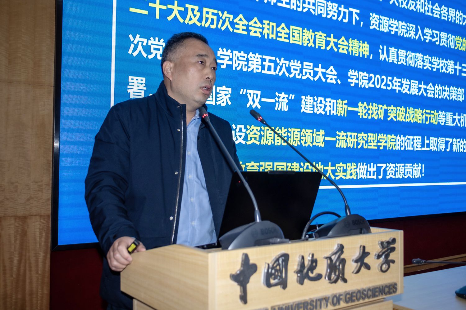 院长朱红涛作学院2025年度工作报告。他从党建与思政工作、师资队伍建设、教育教学与人才培养、科学研究与社会服务、国际交流与平台建设等方面详细介绍2025年工作情况。他指出,一年来,学院深入学习贯彻党的二十大和二十届历次全会精神、全国教育大会精神,认真贯彻落实学校第十三次党代会、学院第五次党员大会、学院2025年发展大会的决策部署,抢抓国家“双一流”建设和新一轮找矿突破战略行动等重大机遇,在奋力建设资源能源领域一流研究型学院的征程上取得了新的进展,会上,朱红涛同步报告了学院2025年度财务情况。