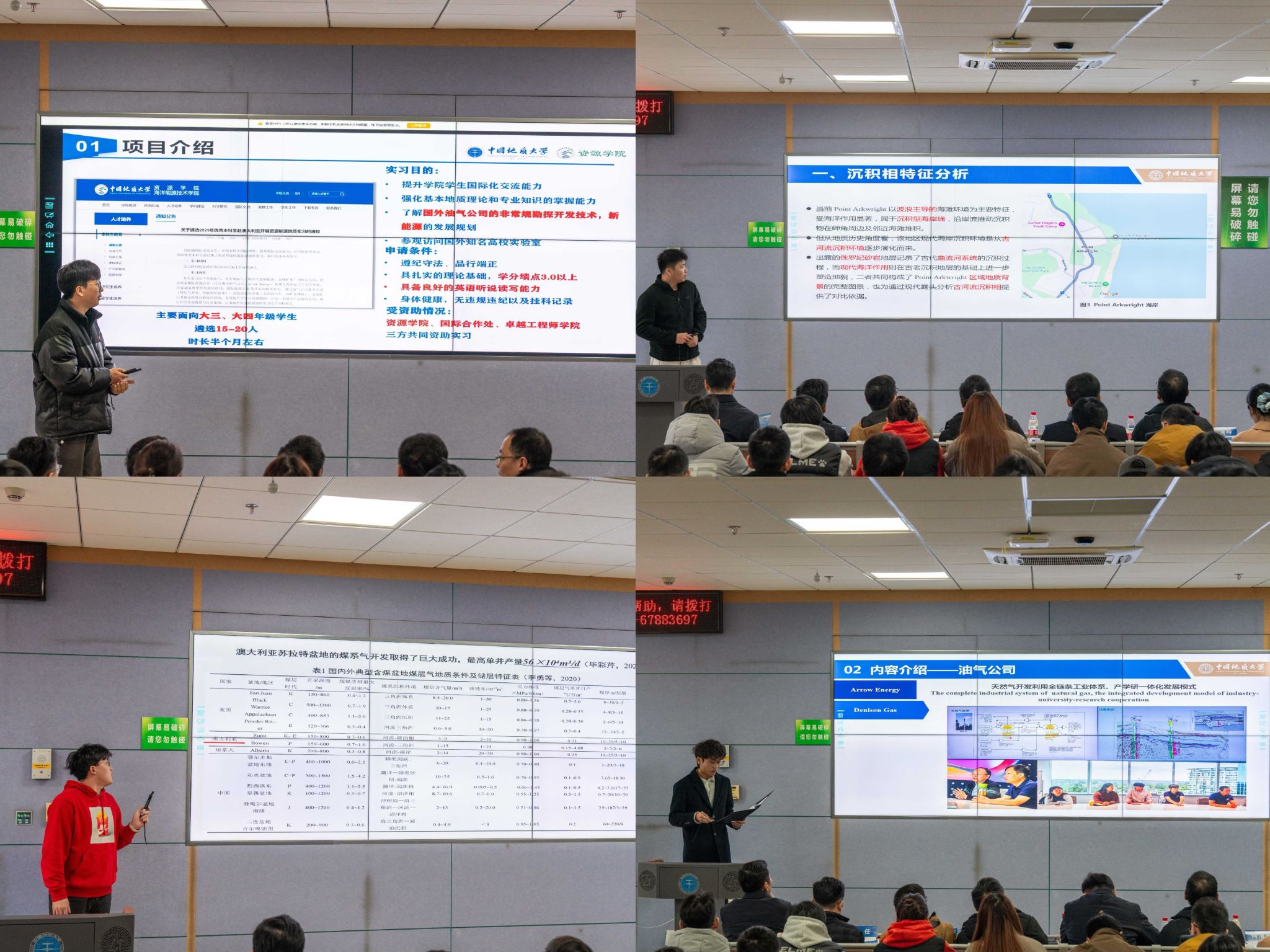 2025年澳大利亚地质实习四个学生小组依次作汇报。汇报中,各小组回顾了从野外地质勘察路线踏勘实测、海外高校学术研讨交流,到企业实地参访、岩心库样本分析实践的完整过程,围绕澳大利亚实习专题研究进行汇报,通过详实的数据、清晰的图表和严谨的分析,展现了扎实的专业基础和良好的科研素养,汇报内容得到在场师生的认可。分享过程中,同学们不仅深化了专业认知,更在对比中增强了对中国资源能源事业发展的自信,深刻认识到资源学子的时代重任,纷纷表示将把所学所获转化为地质报国的实际行动,为保障国家能源资源安全贡献青春力量。