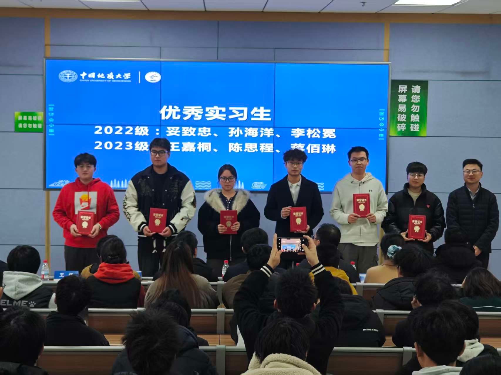 王任为优秀实习生颁发证书。