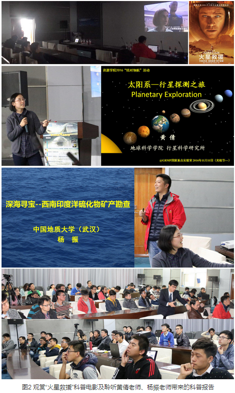 同学们在来到实验室后,利用虚拟现实(VR)设备感受了宇宙与海洋虚拟世界、黄石国家矿山公园三维虚拟场景及岩矿石三维标本,了解了矿产资源形成与勘查开发虚拟仿真实验教学中心与best365网页版登录大冶实践教学基地在虚拟仿真实验教学方面的新进展。接着观看了“救援火星”科普电影片段,聆听了地学院行星所黄倩老师带来的“行星探测之旅”和best365网页版登录资源系杨振老师带来的“深海寻宝——西南印度洋硫化物矿产勘查”科普报告,同学们对深空、深海地质工作中各种高新技术手段以及科研过程充满了兴趣。接下来,徐启东教授、陈建国教授、黄倩老师及杨振老师就地质专业的苦与乐、行星地质及海洋地质方面的专业问题、地质类专业的人才培养等话题与学生开展了互动,学生们积极踊跃提问,气氛活跃,老师们幽默风趣而不失语重心长地为同学们指点迷津。最后,国际地球科学协会地大学生分会(IAMG-SCC)介绍了研究生方面的学习活动及将来在本科生中的会员发展计划,并继续分享了“救援火星”科普电影。