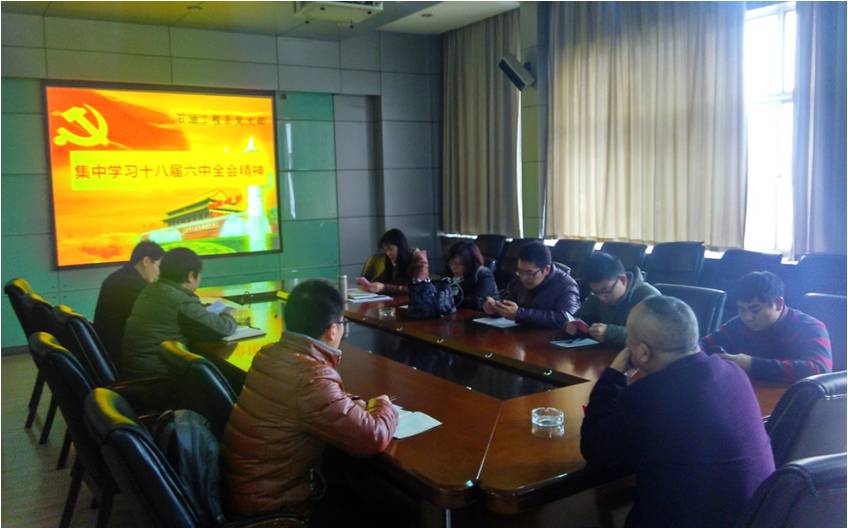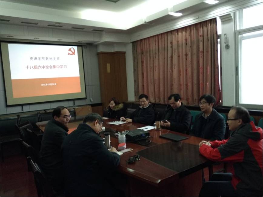 11月24号下午,best365网页版登录石油地质系党支部在主楼九楼930会议室开展了“学习贯彻十八届六中全会精神”支部主题党日活动。这次支部主题党日活动的主题是学习贯彻十八届六中全会精神、学习《中国共产党问责条例》和《关于新形式下党内政治生活若干准则》、《践行“四讲四有”,做合格党员》专题学习和讨论。