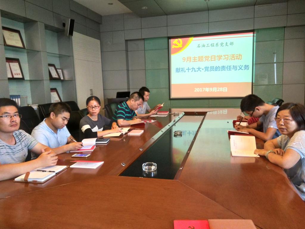 石油地质系支部由支部副书记曹强同志、滕长宇同志带领大家再学习党章内容,并作了相关内容的授课。随后,支部结合“两学一做”支部风采评选活动就如何建设特色党支部,发挥好支部堡垒作用、党员模范作用进行了热烈讨论。党日活动的最后,全支部观看了《还看今朝》和《辉煌中国》两部教育纪录片。