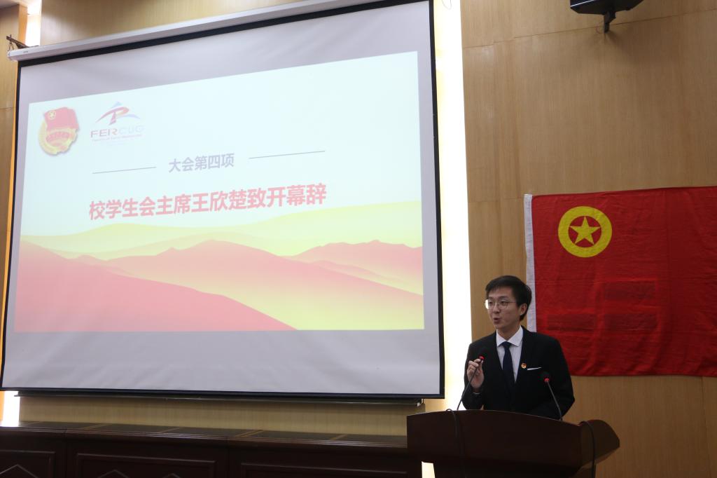 中国地质大学(武汉)学生会主席王欣楚致开幕辞。他表示,新时代的青年应该在修己之路上常怀为公之心,在放大格局中不忘追求精致,为我们的地大梦、中国梦做出更大贡献。