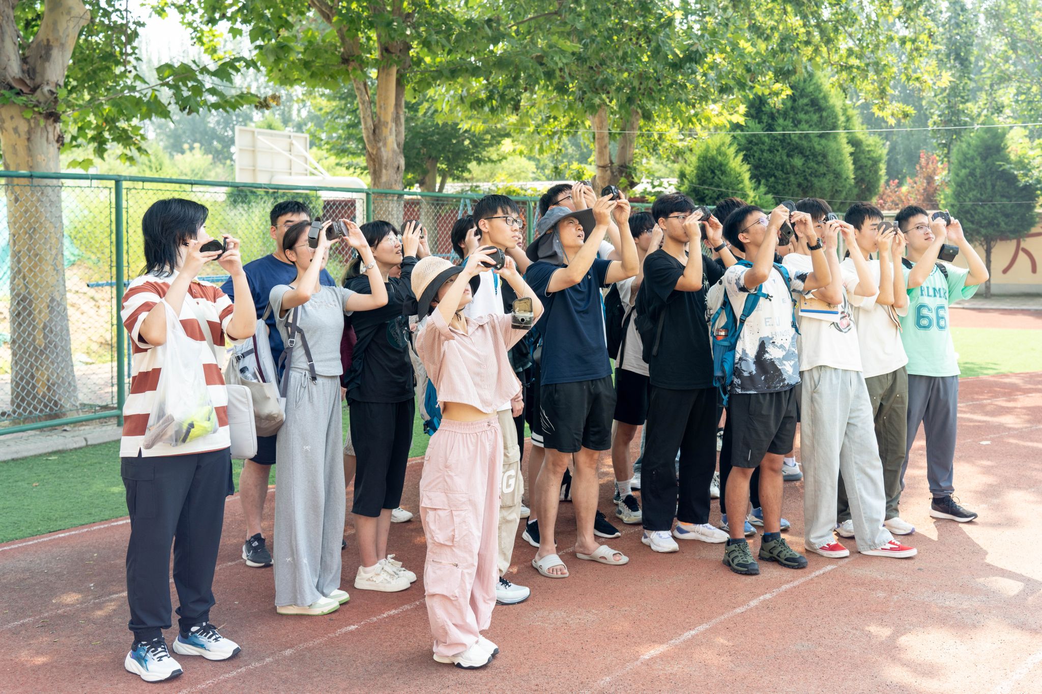 集中教学结束后,由带队老师带领各班级到操场进行分班教学,在老师们的指导下,同学们进行罗盘使用实操训练,调校磁偏角、测产状、测方位……同学们认真聆听、不断尝试,并进行实际操作演示。